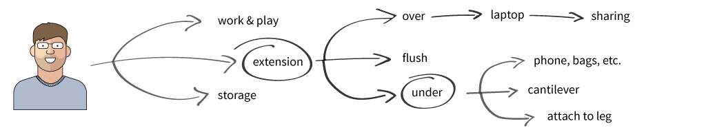 After researching Poppin to better understand how they approach problems and develop their product line, Ethan developed three concepts. These three original concepts were based around (1) work and play, (2) leg storage, and (3) surface extension.